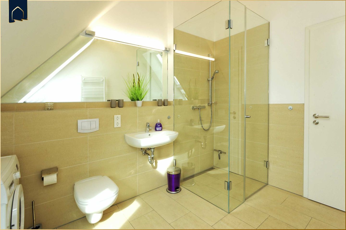 Ein weiteres modernes Badezimmer mit Dusche sowie eine Waschmaschine stehen ebenfalls zur Verfügung. Für Familien mit kleinen Kindern sind zudem Hochstühle und ein Babybett vorhanden.