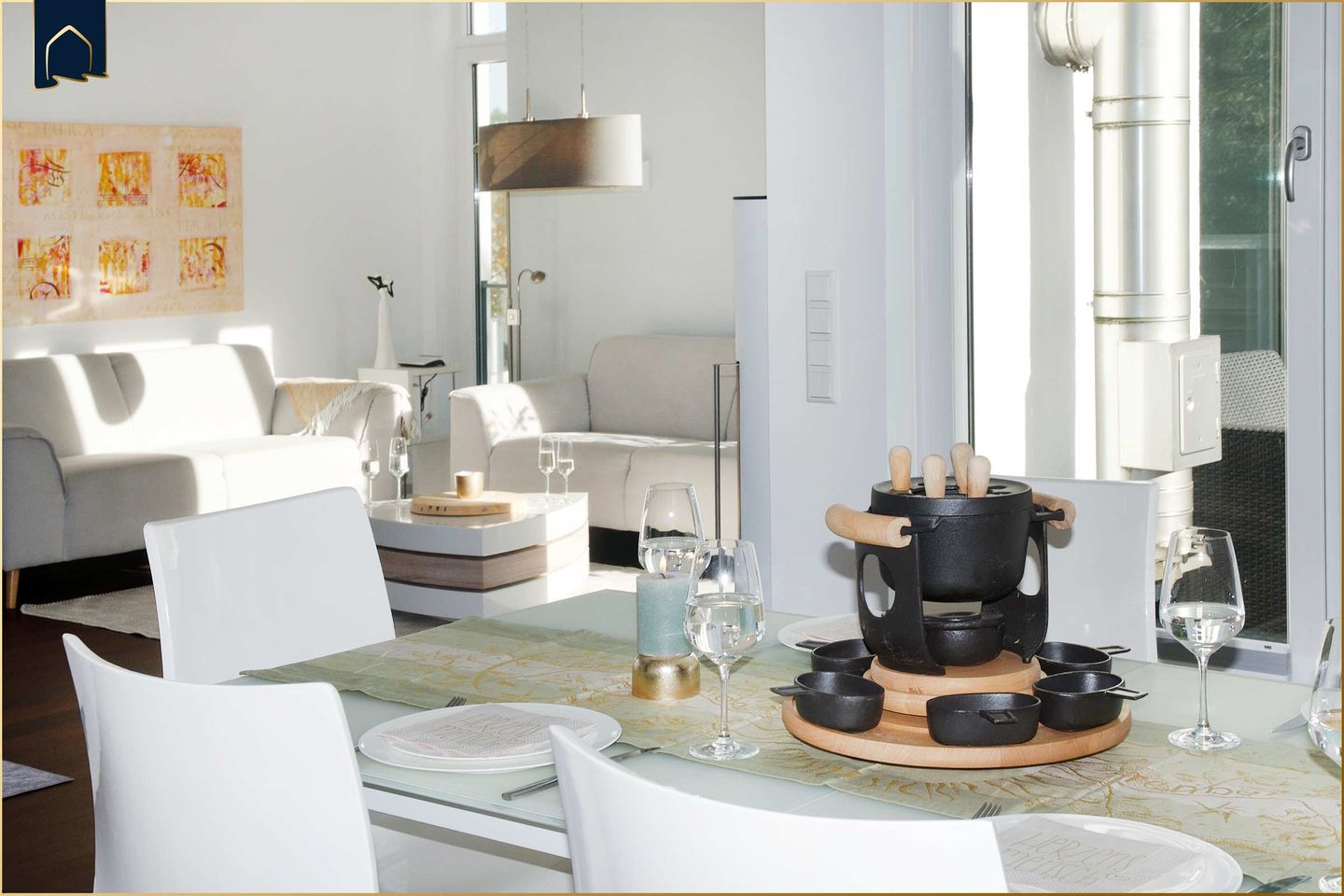 Das Herzstück der Ferienwohnung ist der offene Wohn-, Ess- und Küchenbereich, der durch seine Großzügigkeit und das stilvolle Design begeistert. Eine moderne Kücheninsel mit Induktionskochfeld und Backofen lädt zum gemeinsamen Kochen ein, während Barhocker den perfekten Platz für gesellige Gespräche bieten. Direkt anschließend befindet sich der große Essbereich mit einem Tisch für bis zu acht Personen – ideal für gemeinsame Mahlzeiten und lange Urlaubsabende. Im gemütlichen Wohnbereich sorgt eine komfortable Sofaecke mit Kaminofen für eine besonders behagliche Atmosphäre, besonders in der kühleren Jahreszeit.