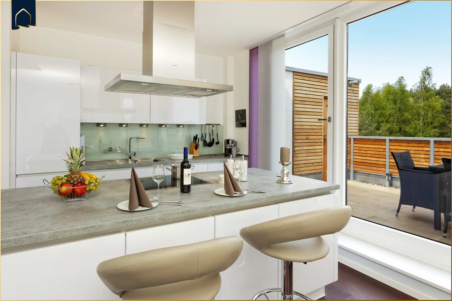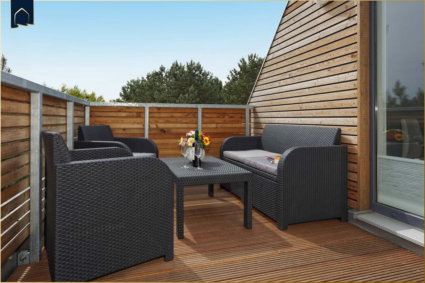 Ein besonderes Highlight sind die beiden Dachterrassen. Die größere Terrasse bietet einen wunderschönen freien Blick in den angrenzenden Mischwald und ist mit einer komfortablen Lounge, einem großen Esstisch und einem Grill ausgestattet – ideal für entspannte Sommerabende. Die kleinere, geschützte Terrasse bietet eine gemütliche Sitzgruppe und einen schönen Blick über die Dächer der Anlage sowie in den gemeinschaftlichen Garten.