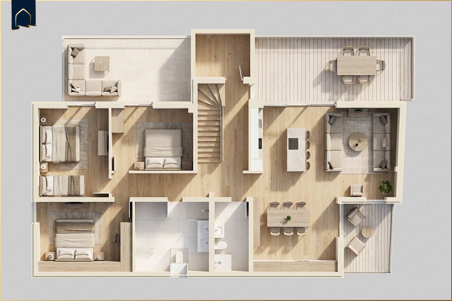 Die Ferienwohnung verfügt über drei individuell gestaltete Schlafzimmer, die Rückzug und Komfort bieten. Das großzügige Hauptschlafzimmer verfügt über ein Doppelbett sowie ein eigenes Badezimmer mit Dusche. Ein weiteres Schlafzimmer ist ebenfalls mit einem Doppelbett ausgestattet und bietet viel Platz zum Wohlfühlen. Besonders außergewöhnlich ist das sogenannte Podestzimmer mit zwei Einzelbetten und einem zusätzlichen Schlafbereich auf einem gemütlichen Holzpodest, der über eine gesicherte Treppe erreichbar ist und besonders bei Kindern sehr beliebt ist.