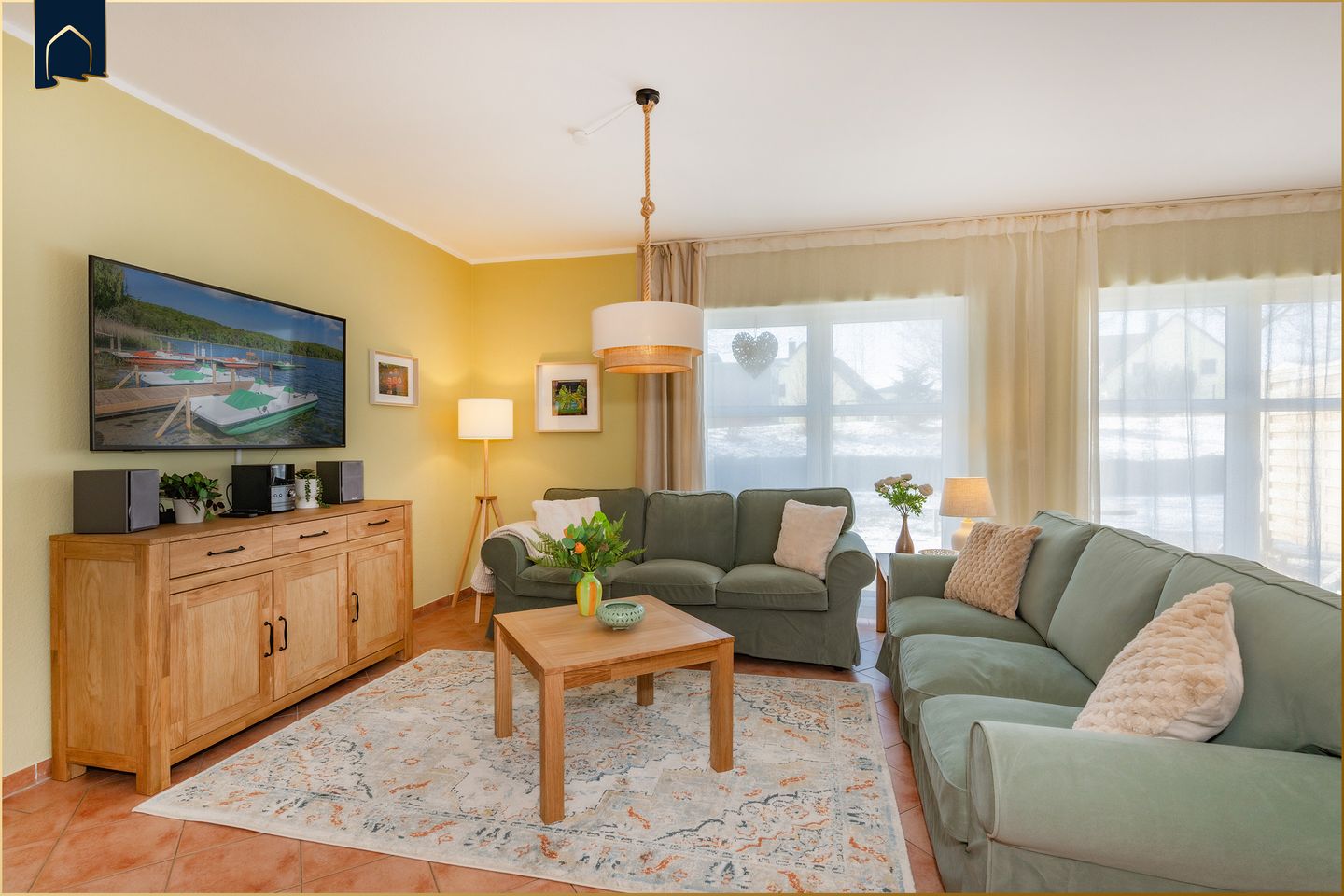 Der geschmackvoll eingerichtete Wohnbereich mit gemütlicher Sofaecke, TV und WLAN bildet das Herzstück des Hauses. Hier genießen Sie entspannte Abende oder nutzen den Arbeitsplatz für eine produktive Workation mit Blick ins Grüne. Der Essbereich mit großem Esstisch lädt zu gemeinsamen Mahlzeiten ein.