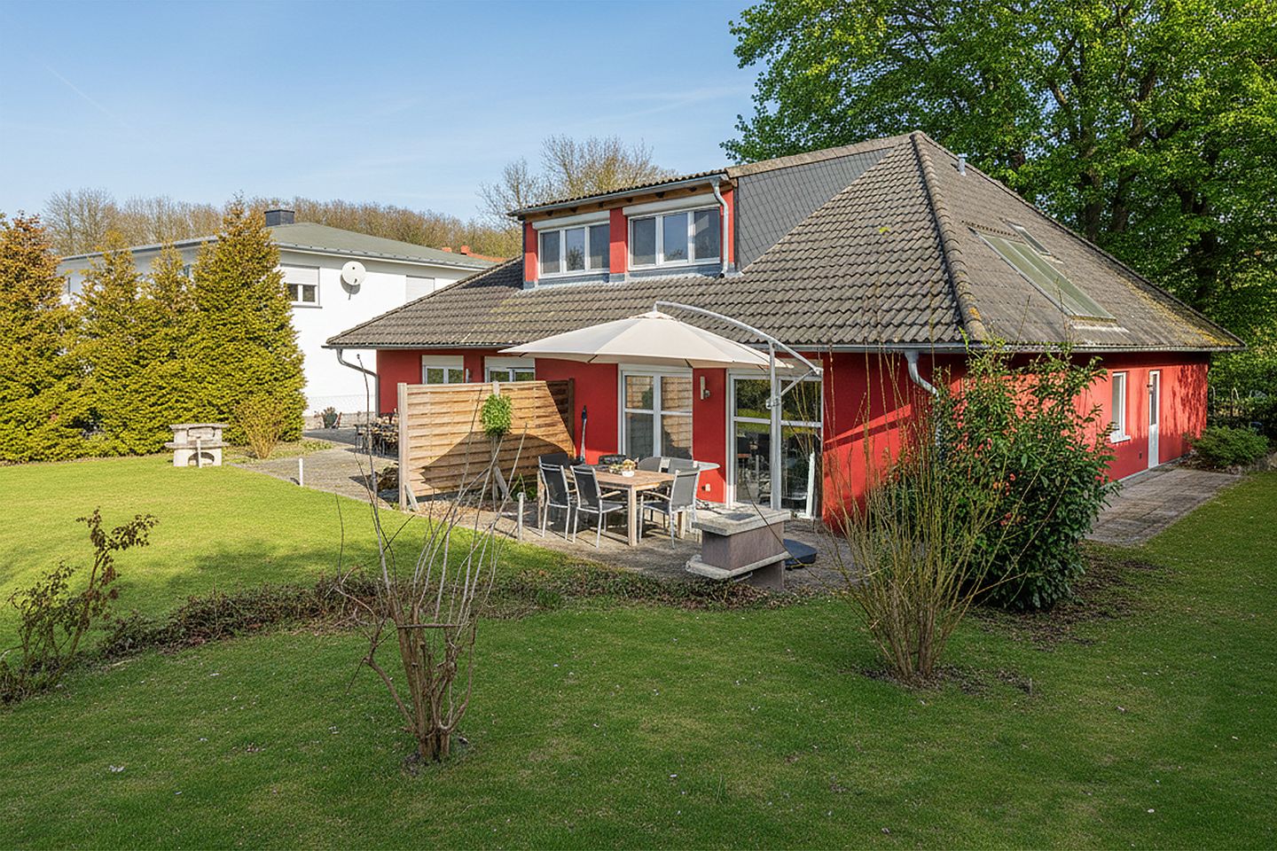 Die sonnige Terrasse mit Gartenmöbeln und Sonnenschirm lädt zu entspannten Stunden im Freien ein. Der Gartenbereich bietet Platz zum Spielen und Erholen. Große Fenster schaffen helle, freundliche Räume und sorgen für ein offenes Wohngefühl. Die Doppelhaushälfte verbindet Privatsphäre mit großzügigem Platzangebot – ideal für Familien, Paare oder Hundebesitzer.