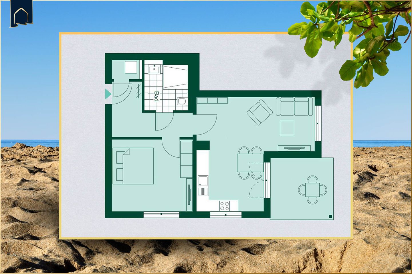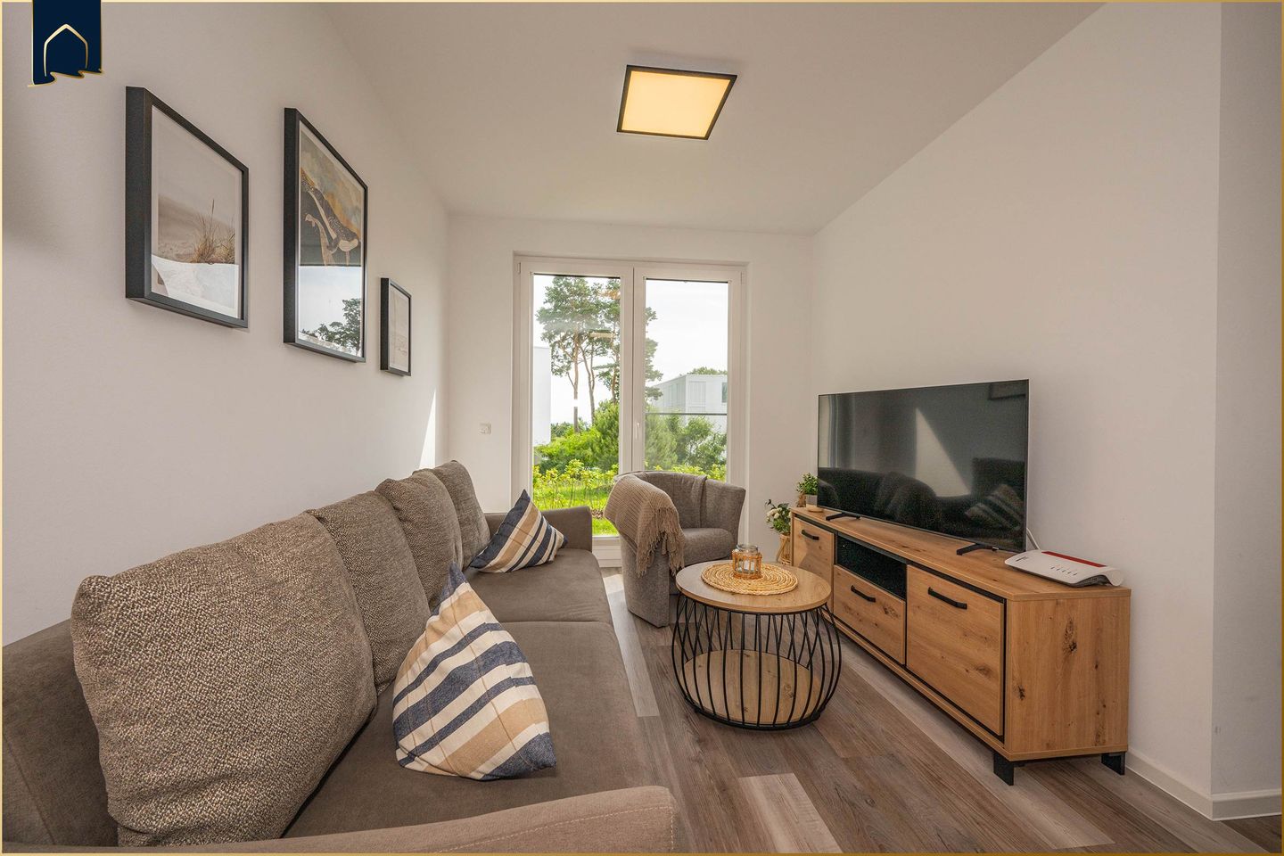 Das helle Wohnzimmer mit Sofaecke, TV (2 Geräte), Esstisch und offener Küche schafft eine gemütliche Atmosphäre. Die Küche ist komplett ausgestattet mit Backofen, Herd, Kühlschrank, Gefrierfach, Spülmaschine, Toaster, Wasserkocher und Kaffeemaschine – ideal für gemeinsames Kochen. Ein Schlafzimmer mit bequemen Schlafmöglichkeiten für bis zu vier Personen sorgt für erholsamen Schlaf. Das moderne Badezimmer verfügt über Dusche, WC und Kosmetikspiegel.