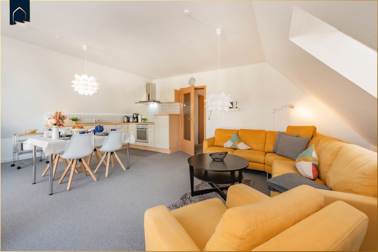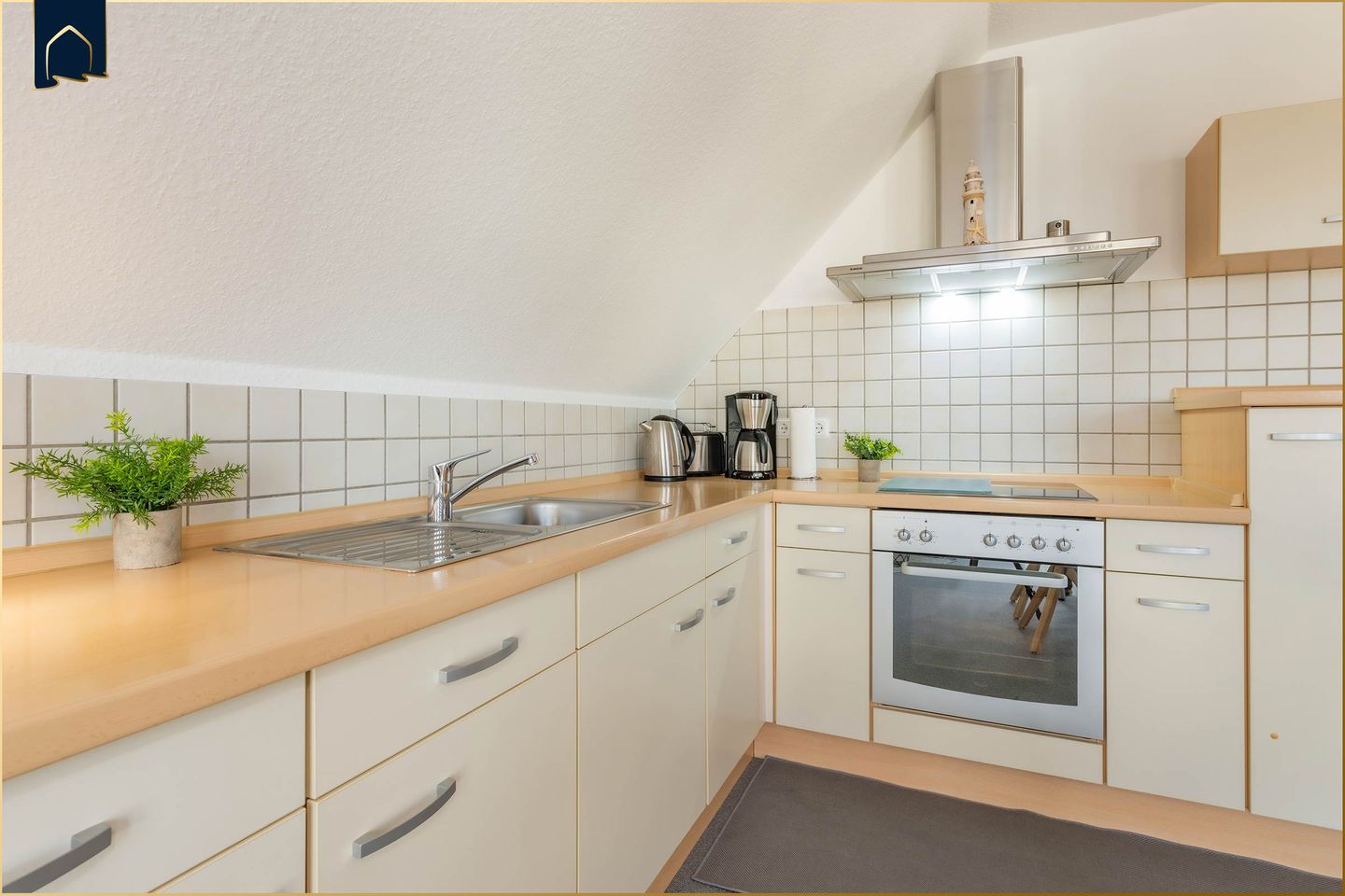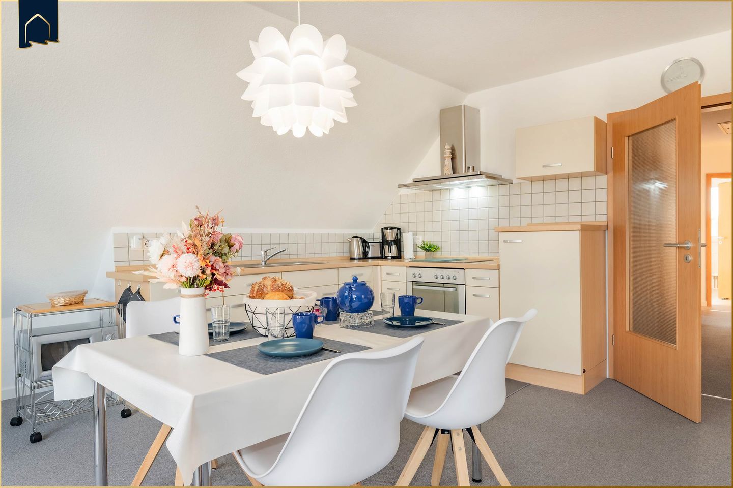 Herzstück der Wohnung ist der offen zum Wohnzimmer gestaltete Küchenbereich, der über einen Herd, einen Backofen, einen Kühlschrank mit integriertem Gefrierfach, Kaffeemaschine, Wasserkocher und Toaster verfügt. Direkt an die Küche schließt sich ein Essbereich mit Esstisch an, der zu gemeinsamen Mahlzeiten in entspannter Atmosphäre einlädt.