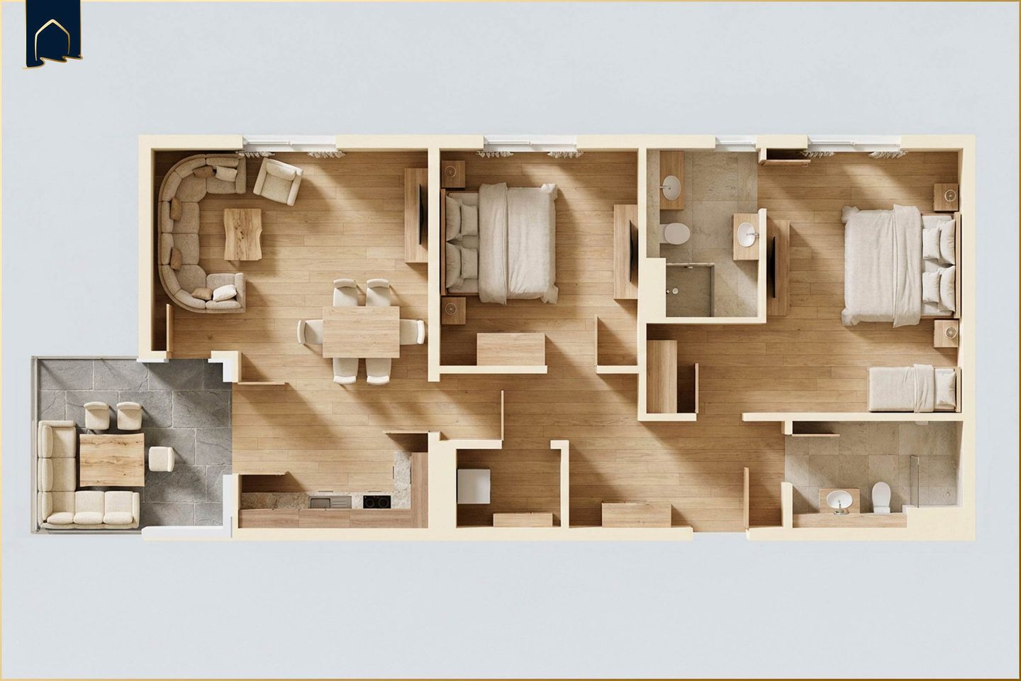 Die offen integrierte Küche ist funktional und komfortabel ausgestattet. Ein Induktionskochfeld, Backofen, Mikrowelle, Geschirrspüler, Kaffeemaschine und Wasserkocher ermöglichen eine flexible Selbstversorgung. Der angrenzende Essbereich lädt zu gemeinsamen Mahlzeiten ein und greift das stilvolle Wohnkonzept mit dezenten goldfarbenen Details harmonisch auf.