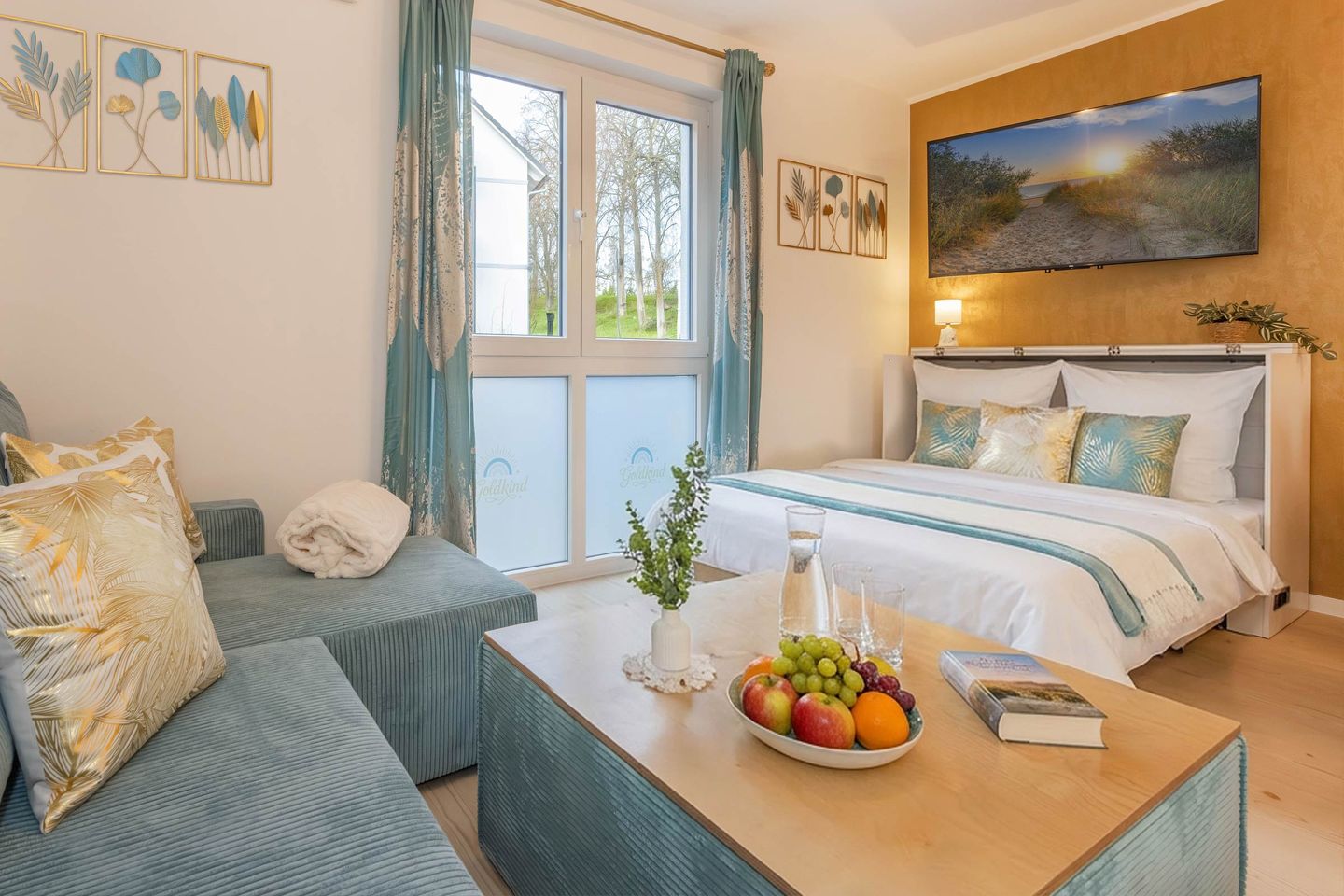 Die Ferienwohnung Goldkind im Ostseebad Kölpinsee auf der Insel Usedom steht für stilvolles Wohnen in strandnaher Lage. Die harmonische Kombination aus warmen Farbtönen, klaren Linien und gezielt eingesetzten goldenen Akzenten verleiht der Wohnung eine besondere Ausstrahlung und sorgt für eine elegante, zugleich einladende Urlaubsatmosphäre. Hier treffen modernes Design und entspannter Ostseecharme aufeinander.