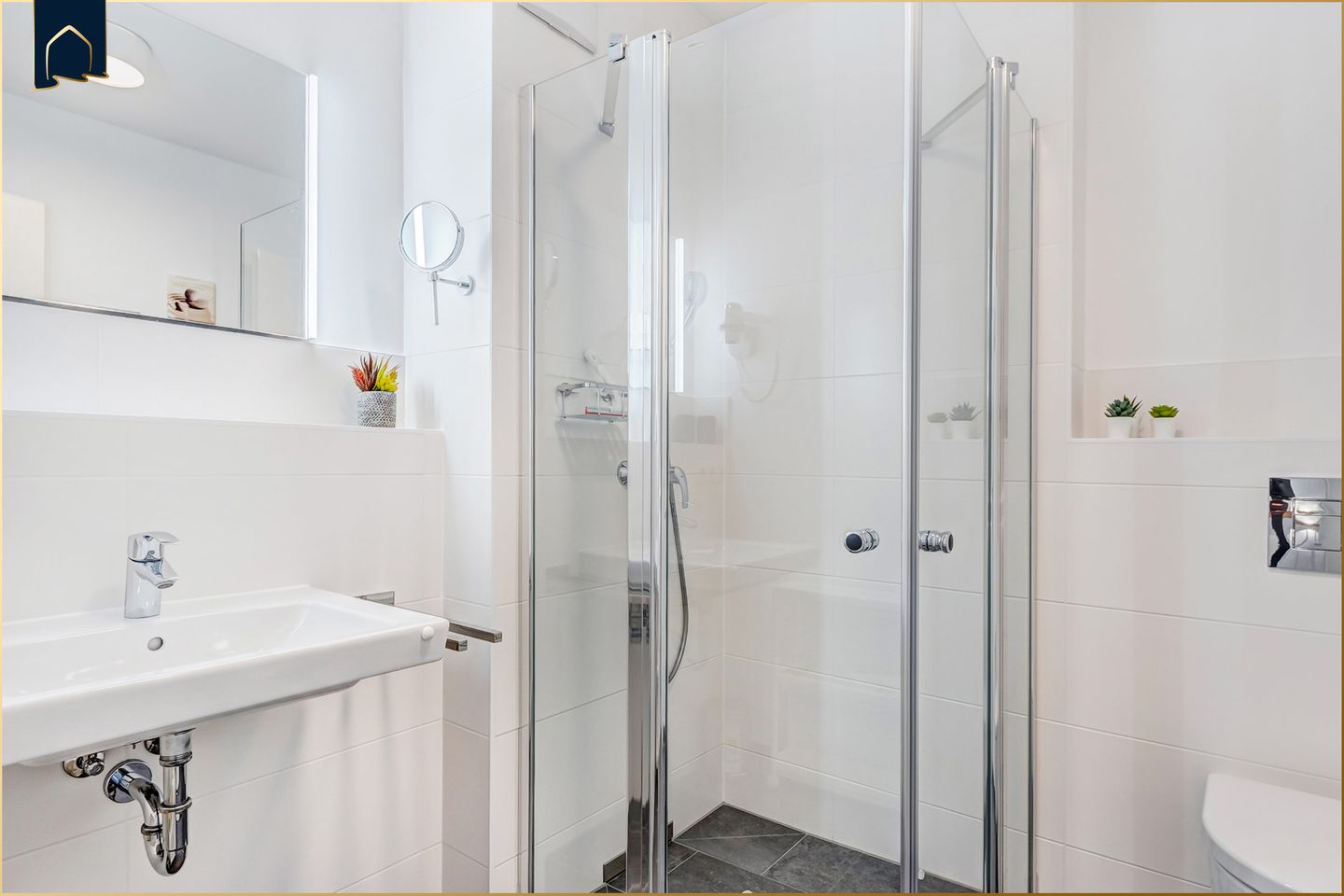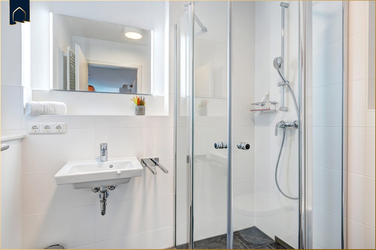 Zwei moderne Badezimmer mit bodengleicher Dusche, WC, Waschbecken, Spiegel, Kosmetikspiegel und Haartrockner sorgen für Komfort – auch bei voller Belegung.