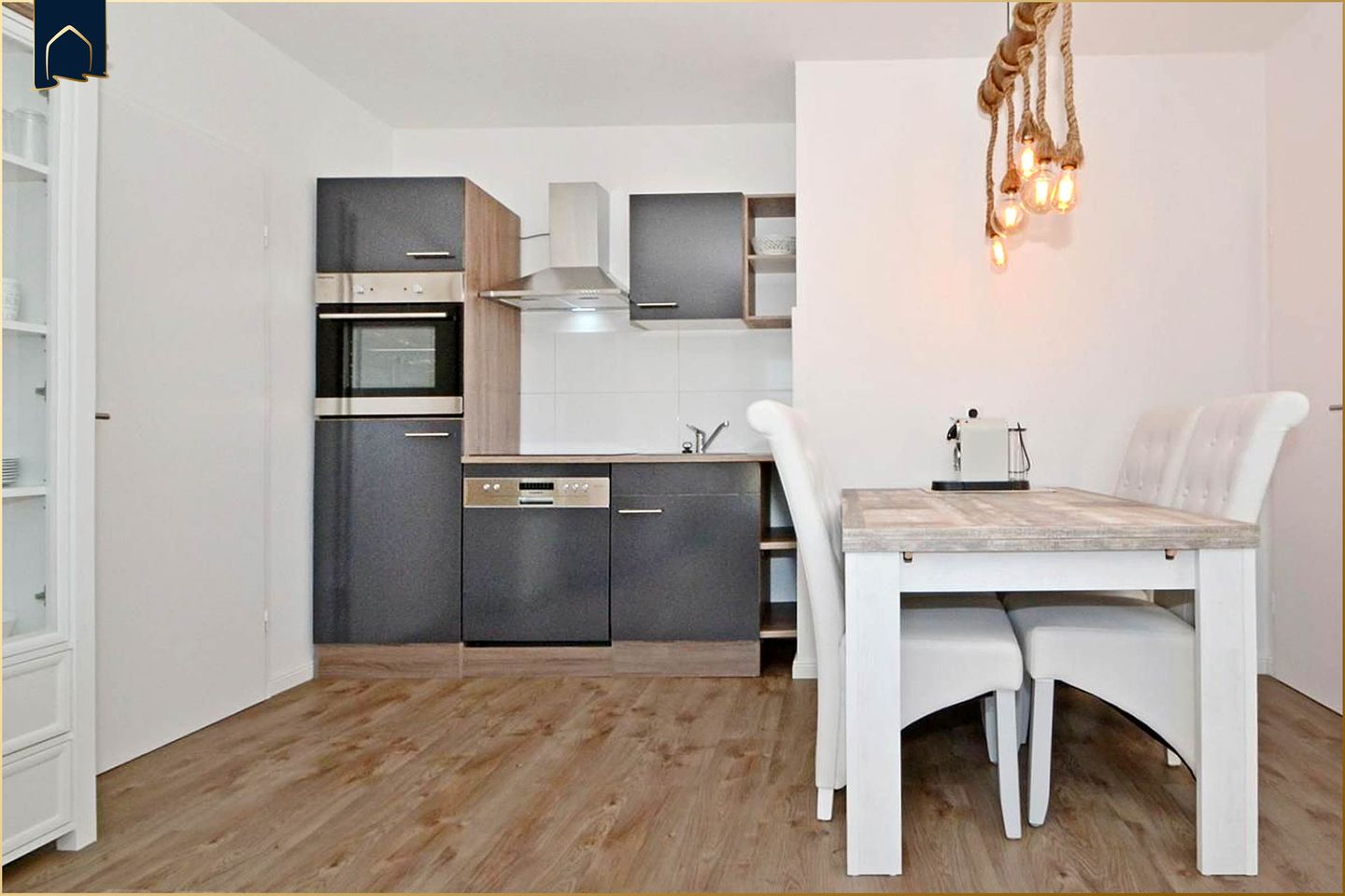 Die voll ausgestattete Küche mit Herd, Backofen, Kühlschrank, Gefrierfach, Geschirrspüler, Kaffeemaschine, Espressomaschine und Toaster lässt keine Wünsche offen – hier können Sie ganz flexibel Ihre Mahlzeiten zubereiten und am Esstisch im offenen Wohnbereich oder draußen auf der möblierten Terrasse genießen. Die großzügige Liegewiese und der gepflegte Garten mit Sonnenschutz und Markise laden zum Entspannen ein.