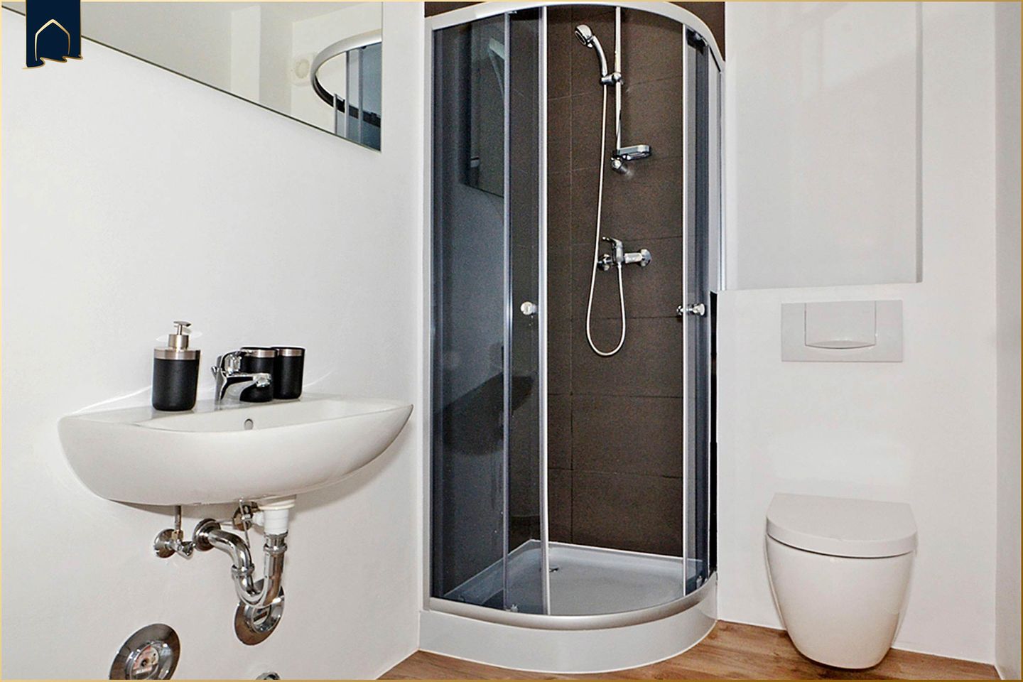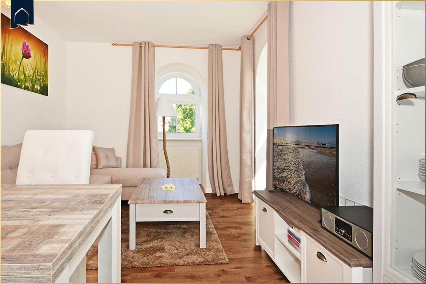 Die moderne Ausstattung lässt keine Wünsche offen: ein gemütlicher Wohnbereich mit Sofa, Sessel und TV, ein separates Schlafzimmer sowie eine gut ausgestattete Küche mit Herd, Backofen, Kühlschrank, Gefrierfach, Kaffeemaschine, Espressomaschine, Toaster, Wasserkocher und Geschirrspüler. Der Essbereich bietet ausreichend Platz für gemeinsame Mahlzeiten. Das helle Badezimmer verfügt über eine Dusche, WC, Waschbecken und Spiegel. Ein Ganzkörperspiegel und ausreichend Stauraum wie Garderobe und Kommode sorgen für zusätzlichen Komfort.