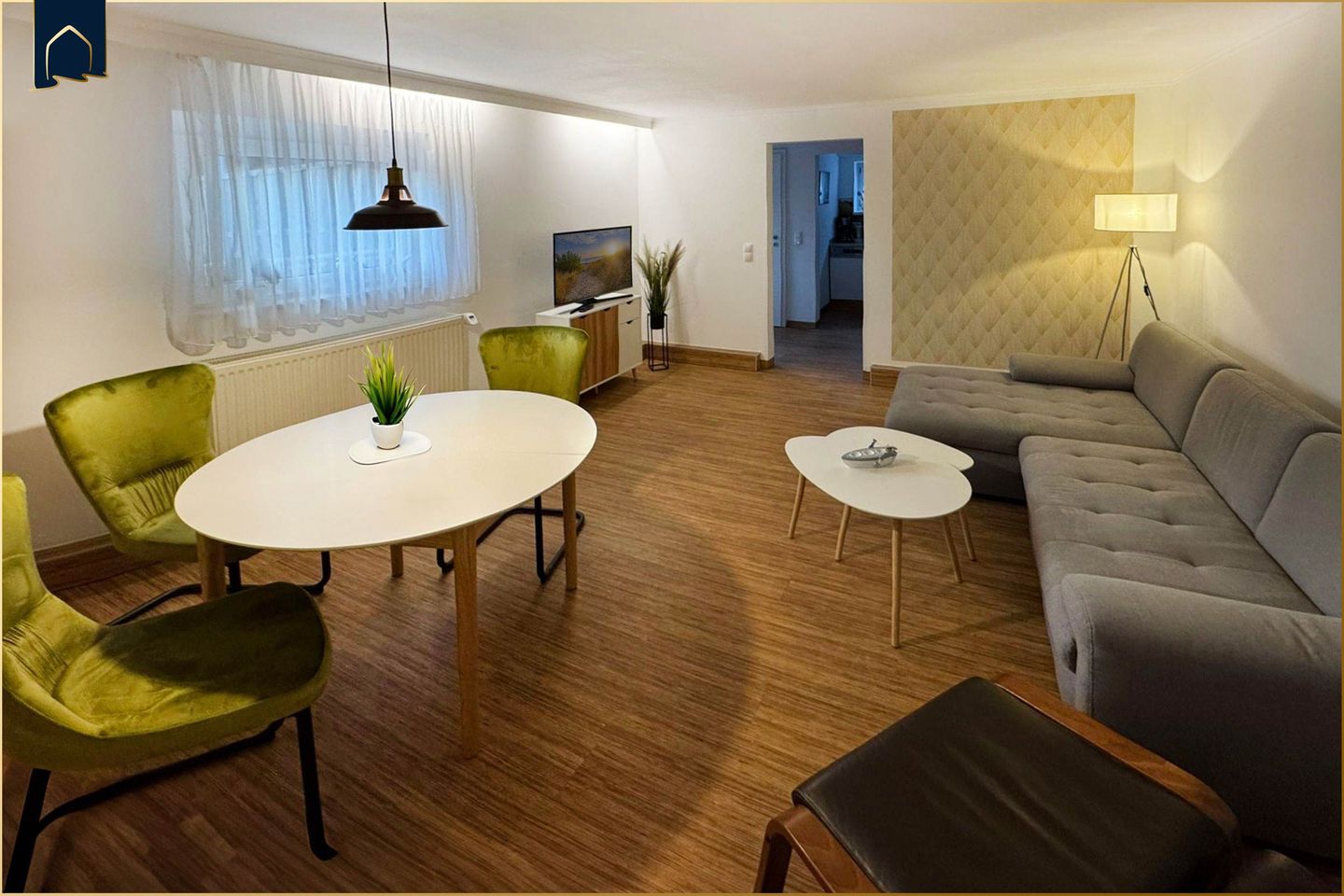 Im großzügigen Wohnbereich erwartet Sie eine gemütliche Sitzecke mit Sofa, Sessel und TV – perfekt für entspannte Abende. Ein separates Schlafzimmer mit komfortablen Schlafmöglichkeiten sorgt für erholsamen Schlaf. Die voll ausgestattete Küche verfügt über Herd, Backofen, Kühlschrank mit Gefrierfach, Mikrowelle, Kaffeemaschine, Wasserkocher, Toaster und Spülmaschine – hier bleibt kein Wunsch offen. Auch ein Essbereich mit Esstisch ist vorhanden. Das moderne Badezimmer ist mit Dusche, WC, Waschbecken und Haartrockner ausgestattet.