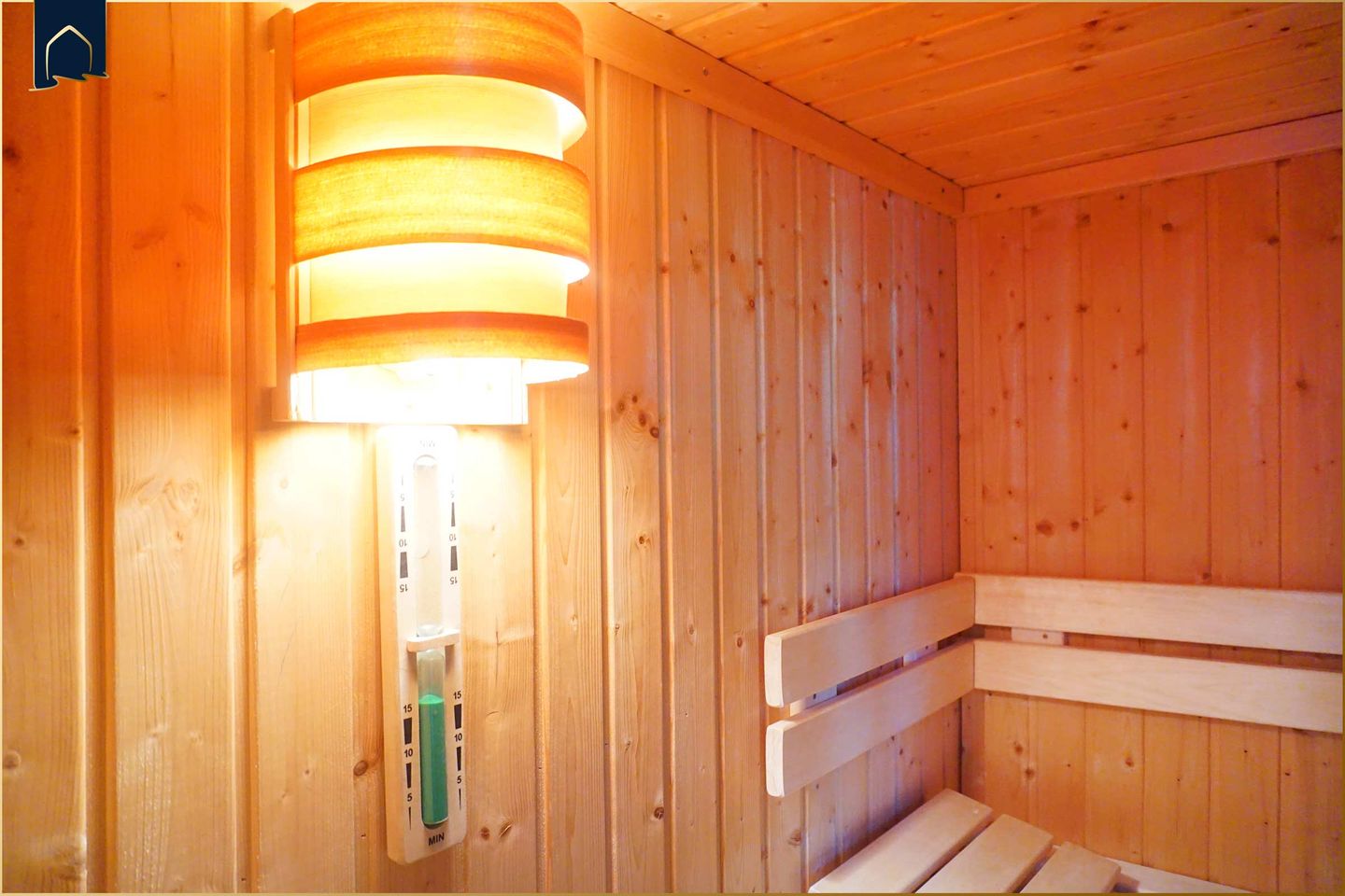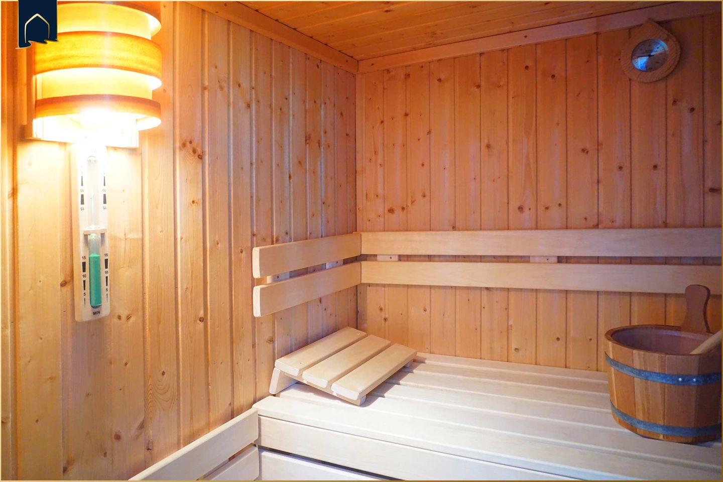 Im Erdgeschoss befindet sich ein Schlafzimmer mit Doppelbett sowie ein Badezimmer mit bodengleicher Dusche, WC und finnischer Sauna – ideal für entspannte Wellnessmomente. Im Dachgeschoss liegen zwei weitere Schlafzimmer, beide mit Doppelbett, eines davon zusätzlich mit TV ausgestattet. Ein zweites modernes Badezimmer mit Dusche ergänzt das Raumangebot.
