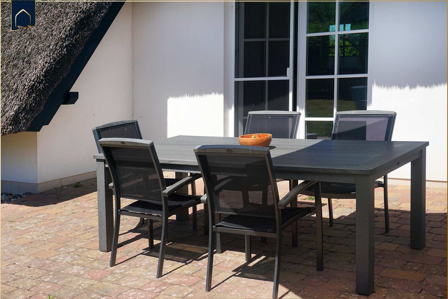 Der Außenbereich ist liebevoll angelegt und bietet eine großzügige Terrasse mit Sitzgruppe, Gartenmöbeln, Sonnenschirm und Strandkorb. Hier lässt sich die Sonne auch an kühleren Tagen genießen, während der Blick in den Garten zum Verweilen einlädt. Ein Elektrogrill steht für gesellige Abende zur Verfügung.
