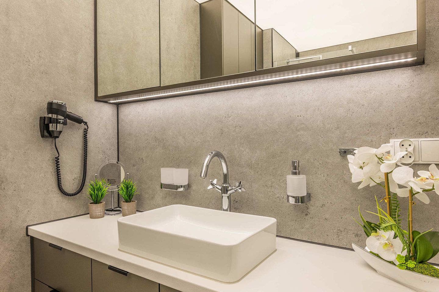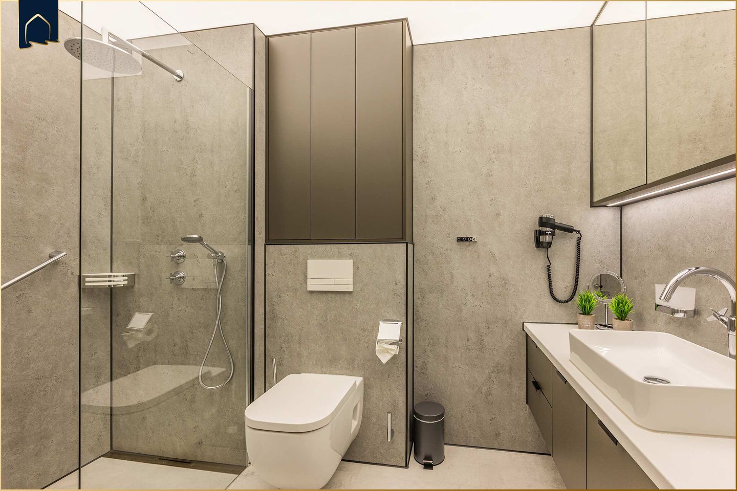 Das moderne Badezimmer ist mit bodengleicher Dusche, WC, Waschbecken, Spiegel und Haartrockner ausgestattet. Eine Waschmaschine und ein Trockner stehen ebenfalls zur Verfügung. Die Wohnung ist ein Nichtraucherobjekt, ein Urlaub mit Hund ist möglich.