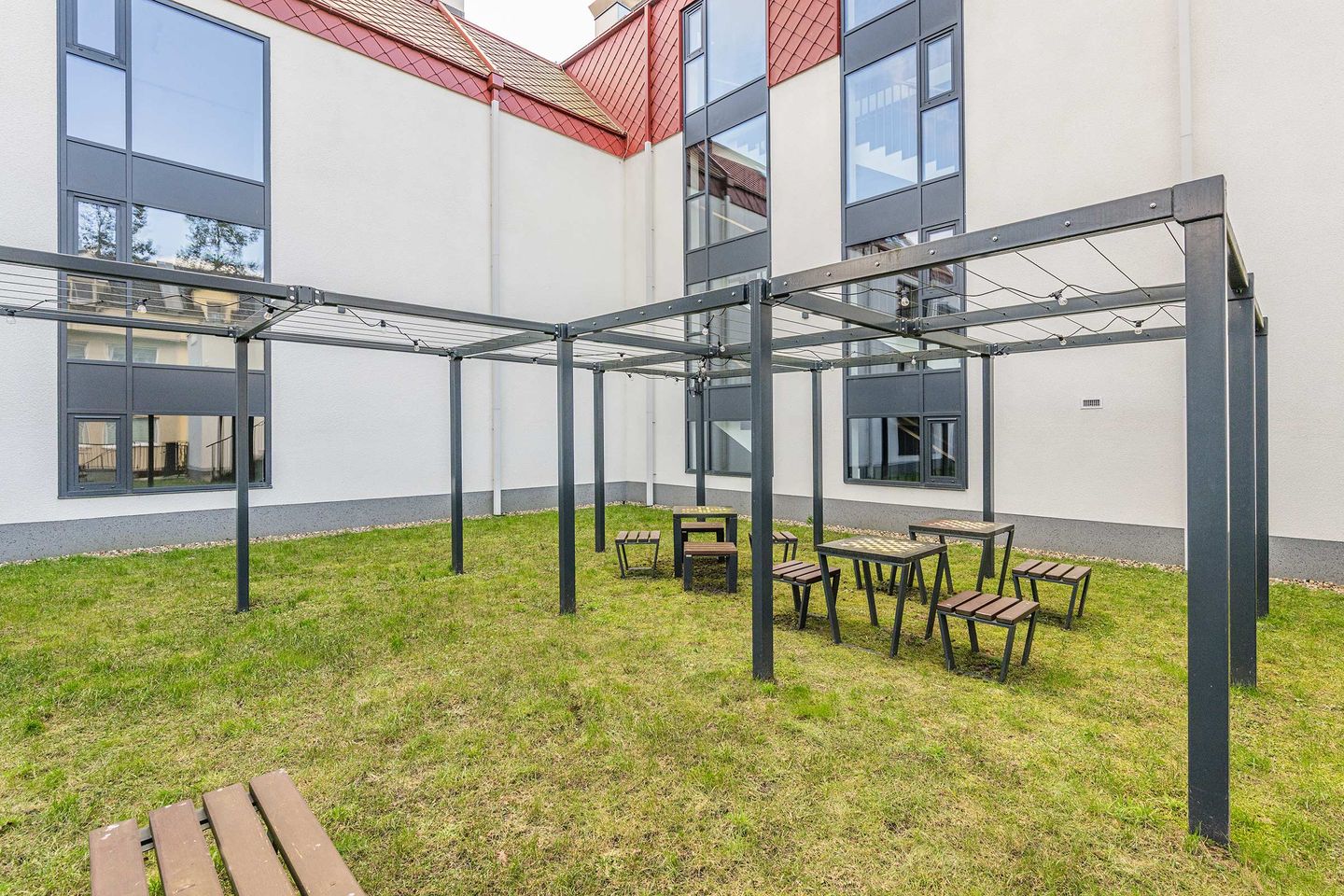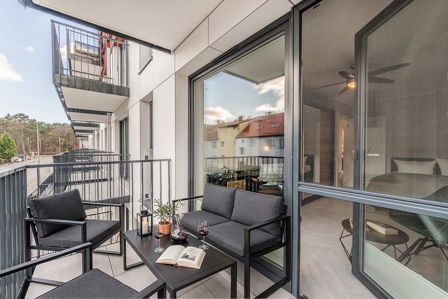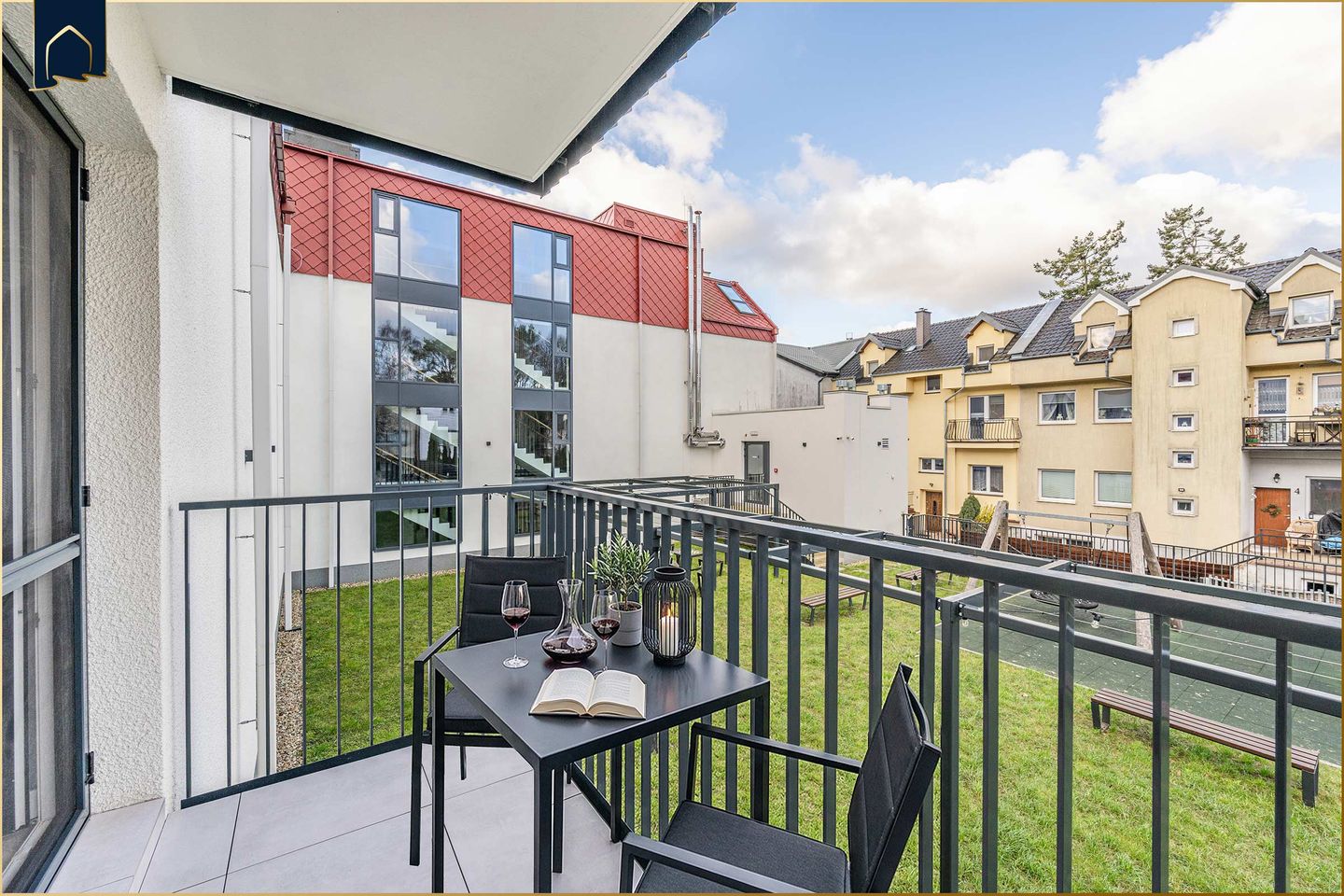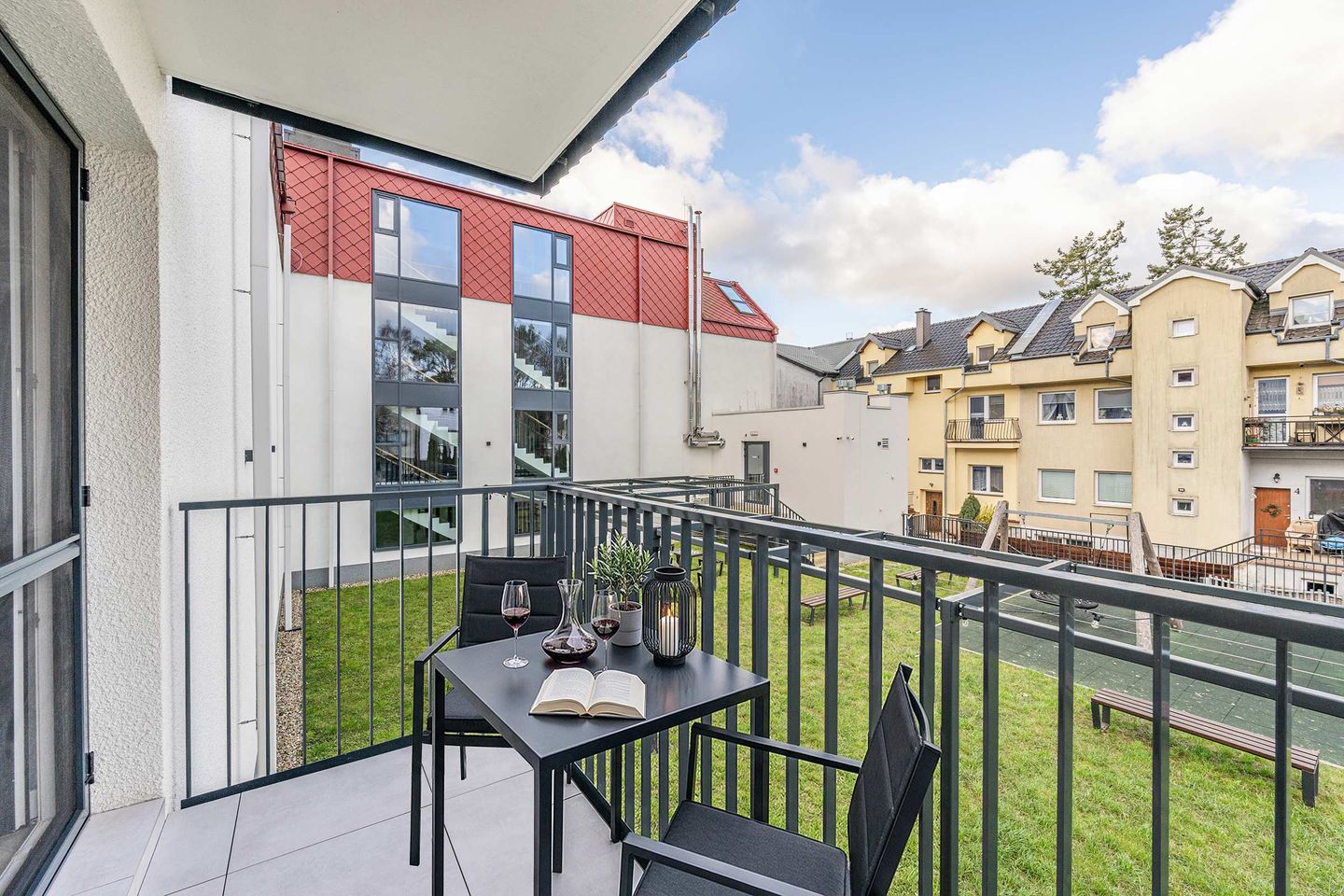 Ein Balkon mit Gartenmöbeln bietet zusätzlichen Raum im Freien und lädt zum Verweilen ein. Ein kostenfreier Privatparkplatz in der Tiefgarage sowie ein Fahrradabstellraum im Gebäude stehen den Gästen zur Verfügung. Das Gebäude ist mit einem Aufzug ausgestattet und ermöglicht einen bequemen Zugang zur Wohnung.