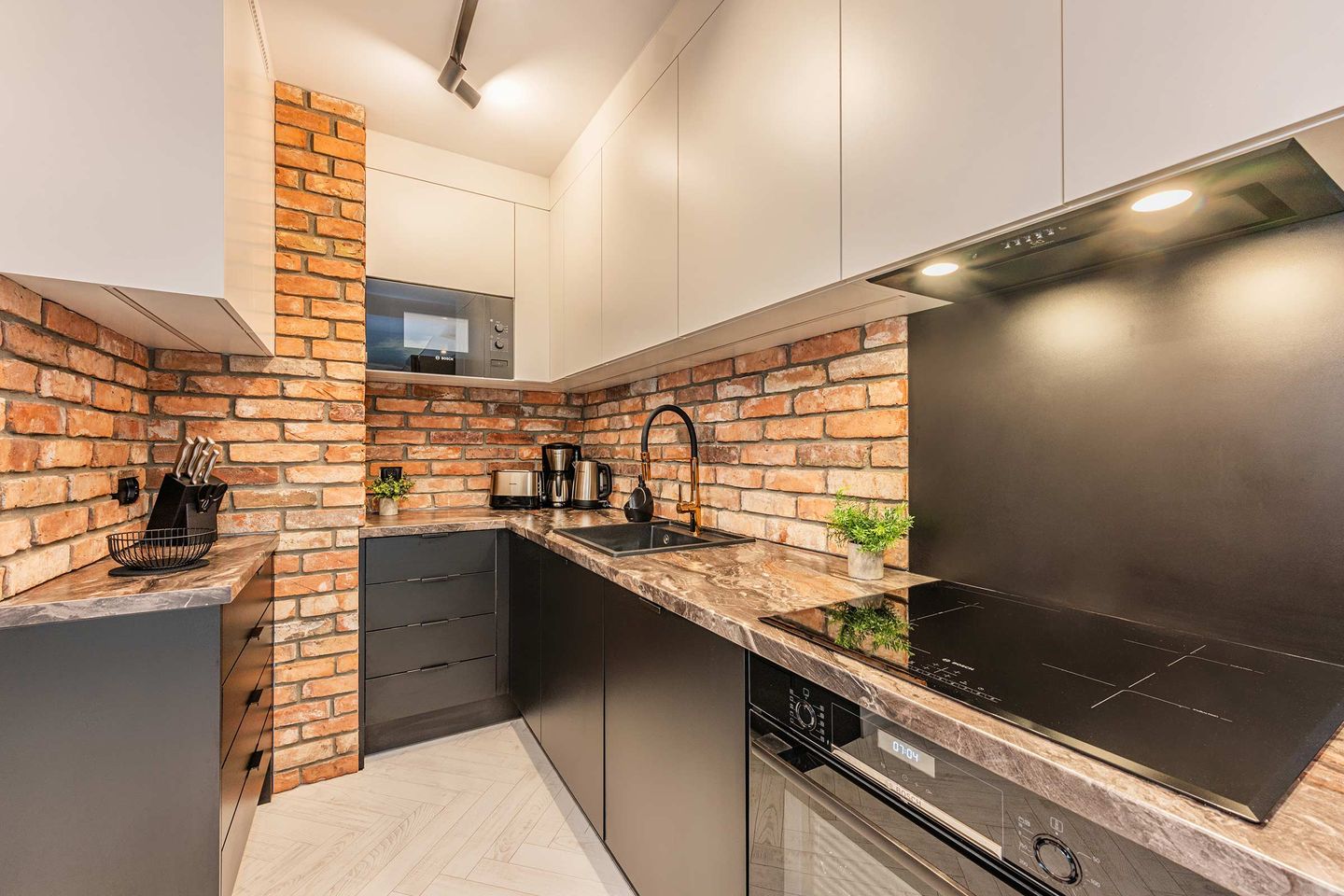 Die offene Küche ist modern ausgestattet und verfügt über Cerankochfeld, Backofen, Mikrowelle, Geschirrspüler, Kühlschrank mit Gefrierfach, Kaffeemaschine, Wasserkocher, Toaster sowie umfangreiche Küchenutensilien. Damit ist eine flexible Selbstversorgung während des Aufenthalts problemlos möglich.