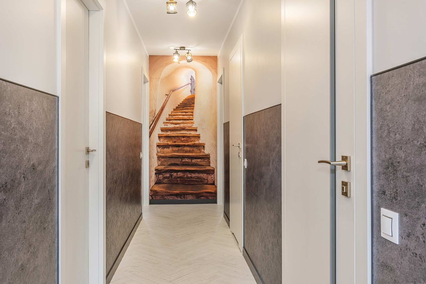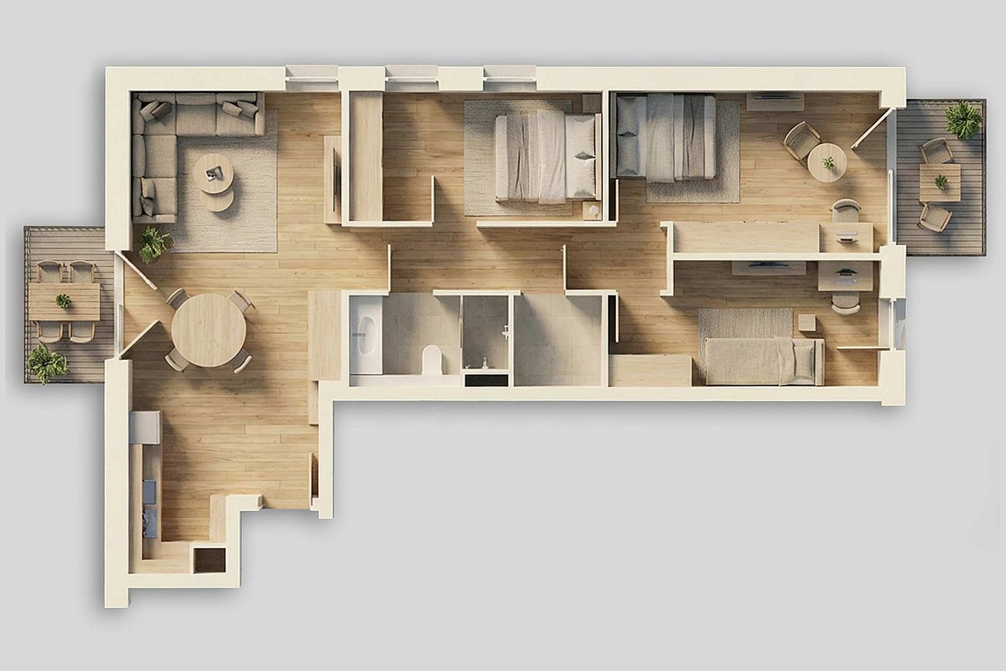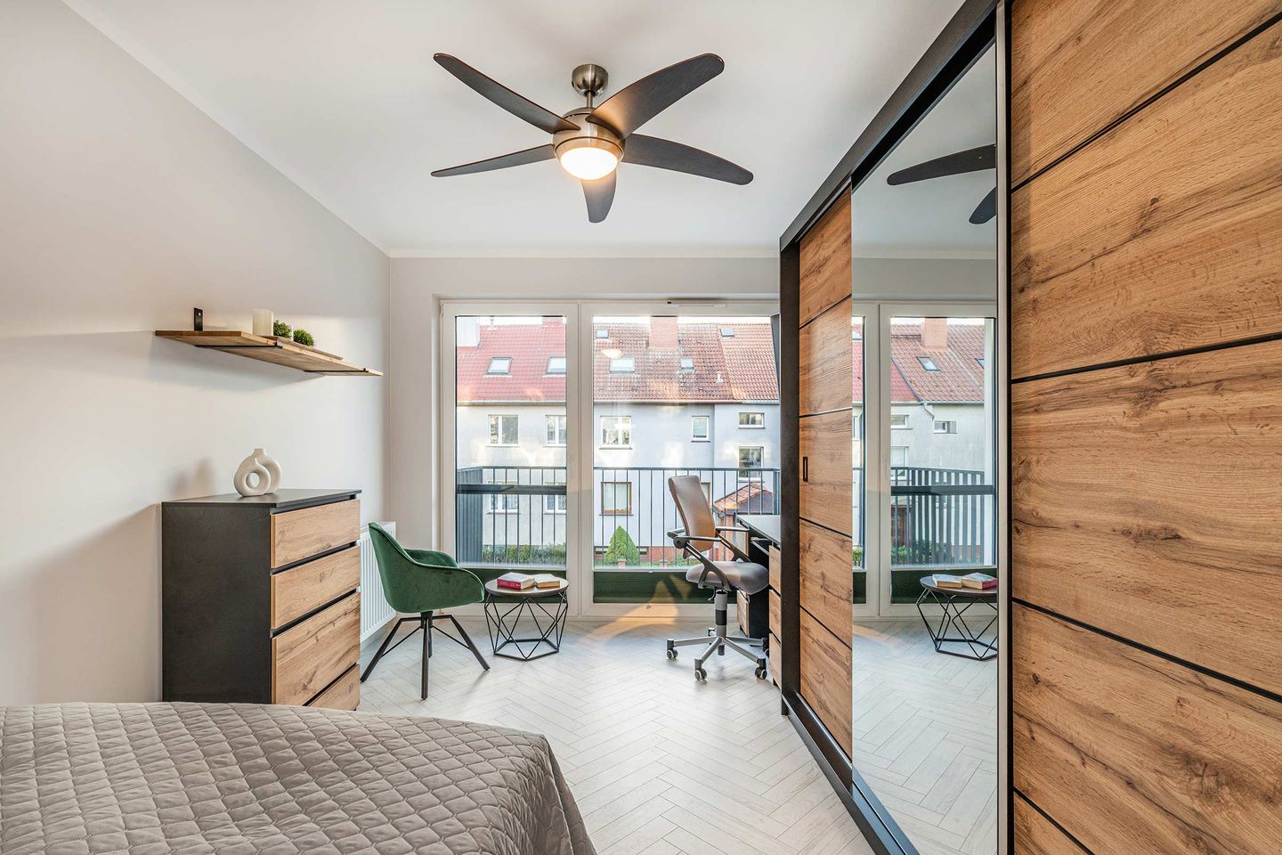 Die Ferienwohnung bietet drei separate Schlafzimmer und insgesamt fünf Schlafmöglichkeiten. Die Schlafräume sind ruhig gelegen und geschmackvoll eingerichtet, sodass erholsame Nächte gewährleistet sind. Ein zusätzlicher Arbeitsbereich mit Schreibtisch ermöglicht auch eine Workation in angenehmer Umgebung.